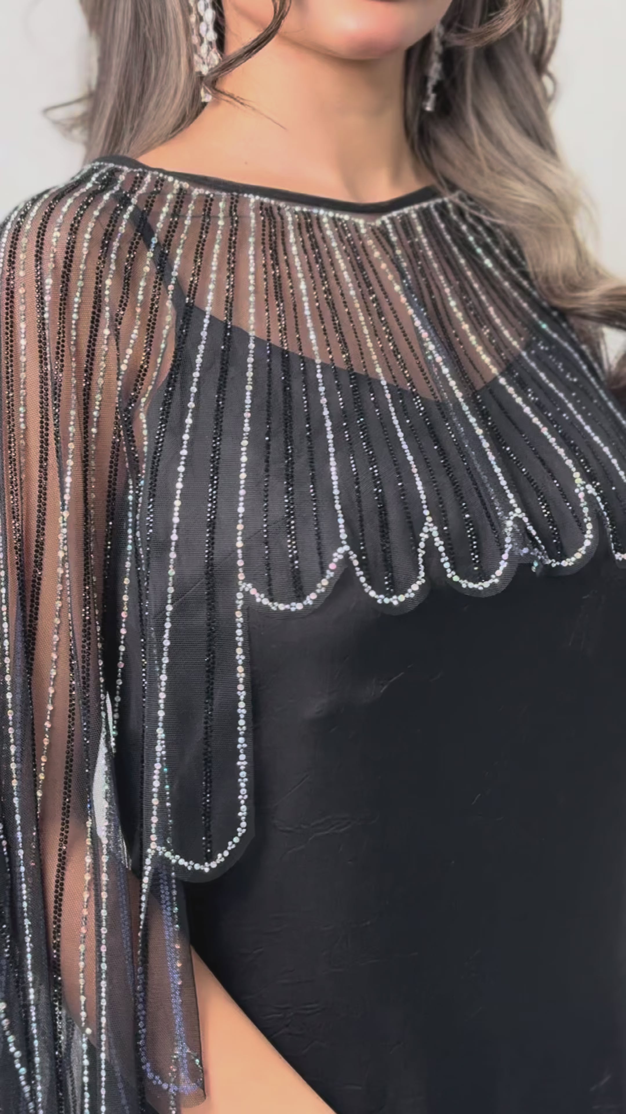 Playful yet refined, this black dress combines a flattering silhouette with chic details. Perfect for special nights out, it’s your go-to piece for making a stylish, confident impression.